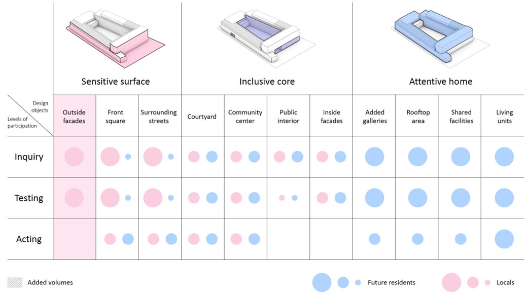 课题鼓励学生在已有设计方法(如下)的基础上根据具体的场地和利益相关者选择最为关键的部分作为研究范围,发展创新的参与式设计的方法和工具并作用于设计。参与式设计(participatory design)指非专家利益相关者(non-expert stakeholder)使用参与式工具介入设计过程的设计方法。自20世纪80年代以来,参与式设计方法在各个设计领域得到了发展,并开发了从交谈到棋盘游戏的多种参与式工具。Plattner, Meinel和Leifer介绍了一种通用的参与式设计方法,包括了一系列发散和收敛的阶段,从范围确定(scoping)到访谈(interviewing),到生成观点(Points of View),再到迭代(iteration)到最终输出(outputs)。Martin和Hannington将类似的方法总结为五个阶段:定义、探索、概念生成、评估、启动和监测。Leung关于城市空间参与式设计的方法包括三个阶段:语境探究、想法综合和测试。总结来说,参与式设计在建筑设计中可以分为询问(inquiry),设计测试(design testing),自搭建(self-building)和管理(management)四个级别,在此过程中2D/3D的物理和数字工具被广泛利用来吸引参与者。